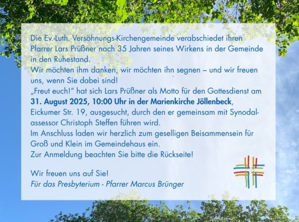 Der Dank- und Abschiedsgottesdienst von Pfarrer Lars Prüssner ist am 31.08. um 10 Uhr in der Marienkirche Jöllenbeck mit anschließenden geselligen Beisammensein im Gemeindehaus.